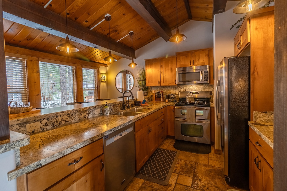 ¡Ahora con aire acondicionado! Cabaña de estilo alpino renovada, enclavada en un barrio fantástico y privado. Perfectamente situado entre Northstar, Squaw, Tahoe City y Kings Beach. Hay un enorme terreno contiguo para disfrutar, así como cientos de kilómetros de senderos para ir en bicicleta, caminar y pescar a pocas manzanas. Hay un dormitorio en la planta baja con un baño adjunto, así como un dormitorio en el altillo de la planta superior con baño contiguo. Conexión wifi de malla de 250 mb, cargador para vehículos eléctricos Tesla (se aplican tarifas de uso).