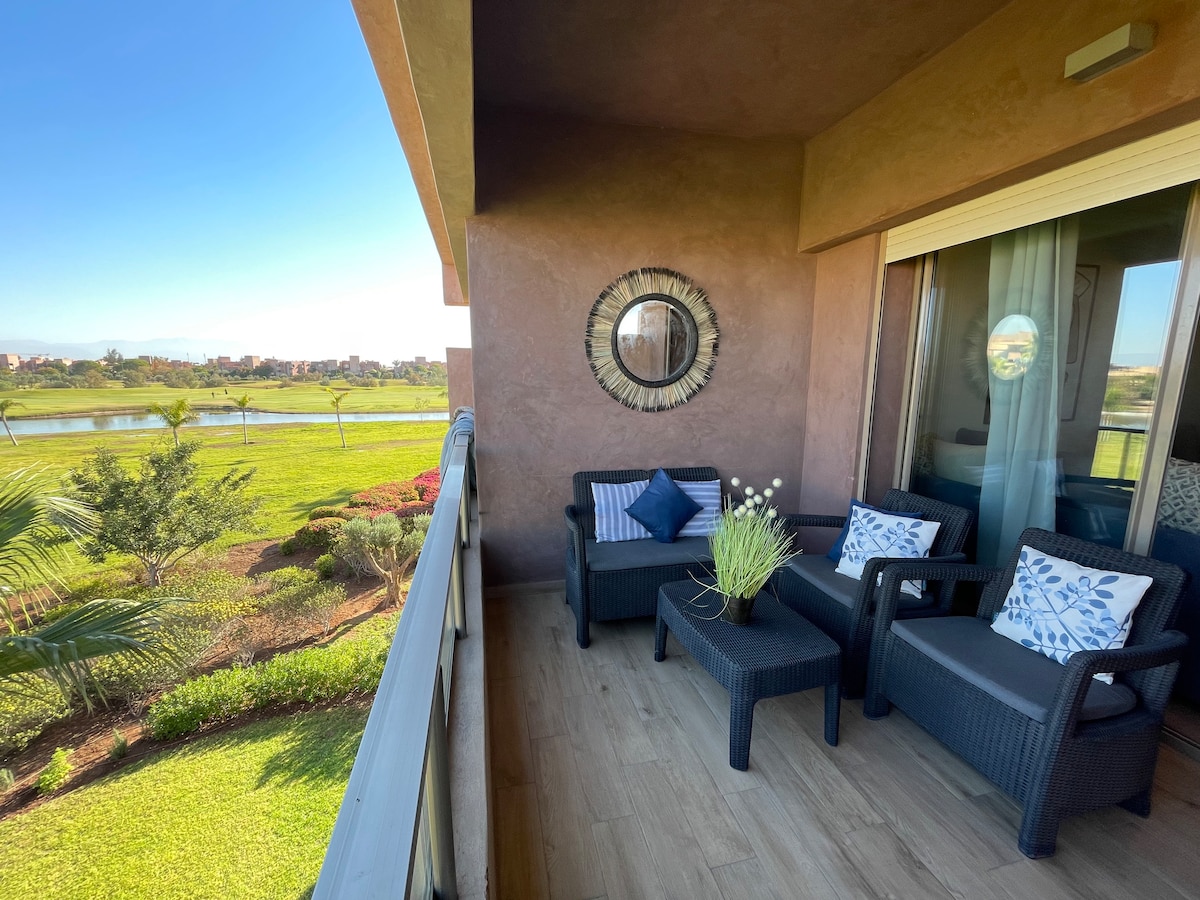 Ubicado en el corazón de la prestigiosa zona turística Marrakech Golf City, descubra este lujoso apartamento con unas vistas excepcionales del campo de golf, la piscina y las majestuosas montañas del Atlas. El apartamento ha sido decorado con amor con un estilo moderno, bohemio y beldi-chic. Está totalmente equipado y ofrece servicios de alta gama La residencia está orientada hacia las montañas del Atlas, es muy popular por su entorno tranquilo y seguro y su proximidad al centro de la ciudad