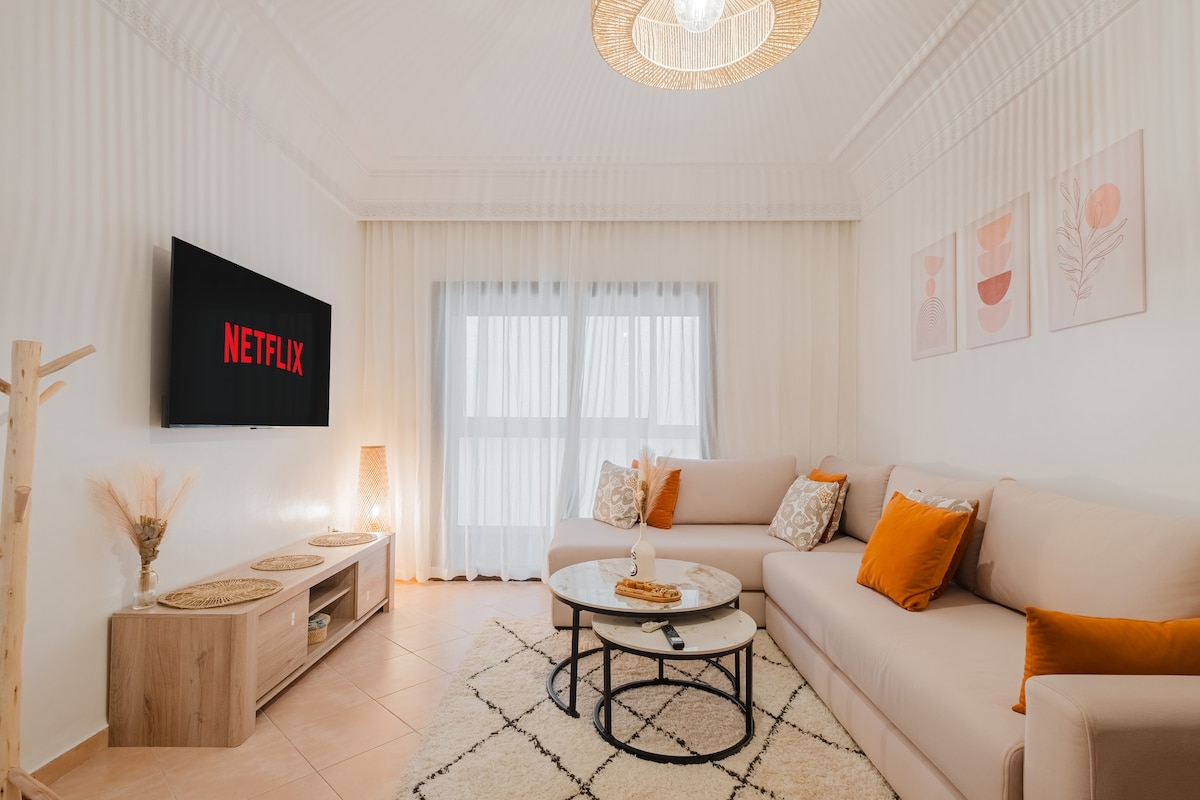 Bienvenido a PALACE SUITES II • ¡un apartamento moderno en el corazón de Gueliz! Elegante habitación con armario, home cinema y Netflix, salón con TV 65'' IPTV, cocina totalmente equipada, baño completo y terraza con magníficas vistas. A 2 minutos a pie de la estación de tren y de la Plaza, disfrute de una estancia que combina comodidad, lujo y relajación absoluta en Marrakech. 🌇✨