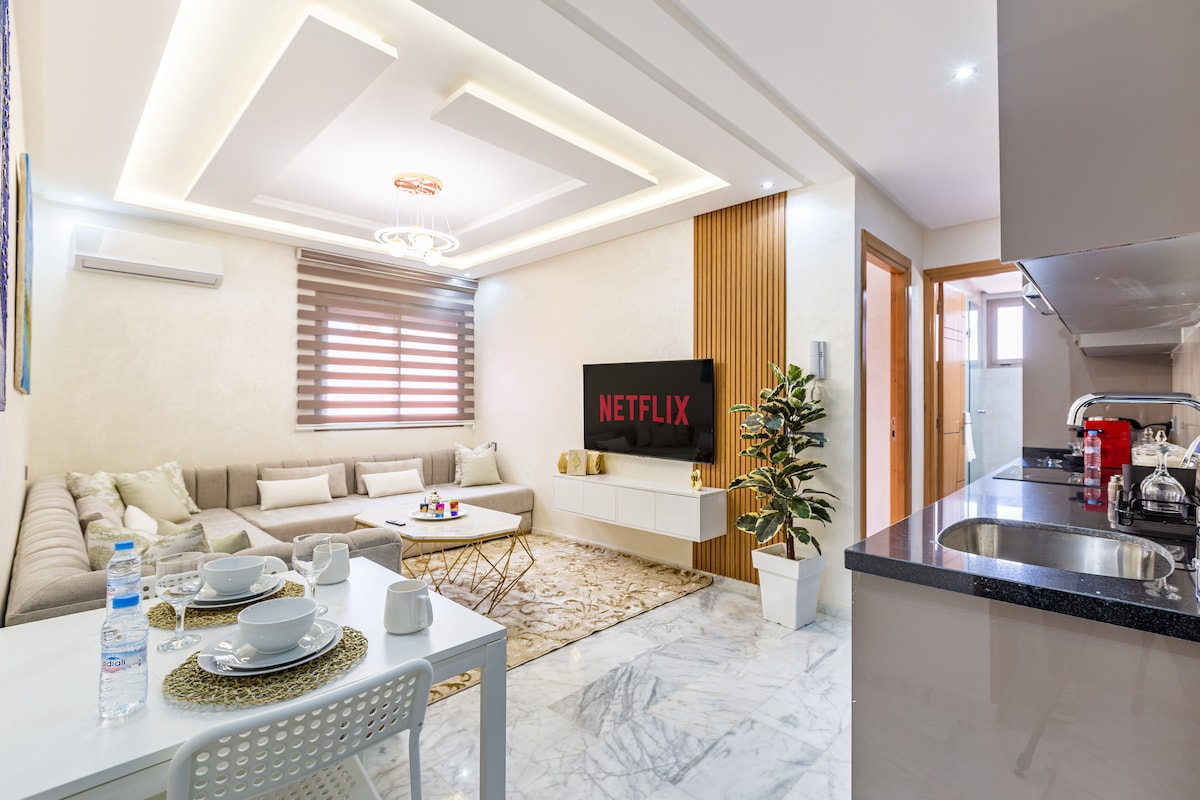 Descubre nuestro lujoso apartamento que ofrece un gran salón con terraza, 1 dormitorio con una cama grande, una cocina moderna totalmente equipada y un baño con jacuzzi. Situado en pleno corazón de la zona de invernada, cerca de los servicios, a 2 minutos a pie del casino, a 5 minutos en coche de la plaza Jemaa el-fna y a solo unos pasos encontrará una gran variedad de restaurantes como NOTO, KHOYA, HUQQA... y muchos más.