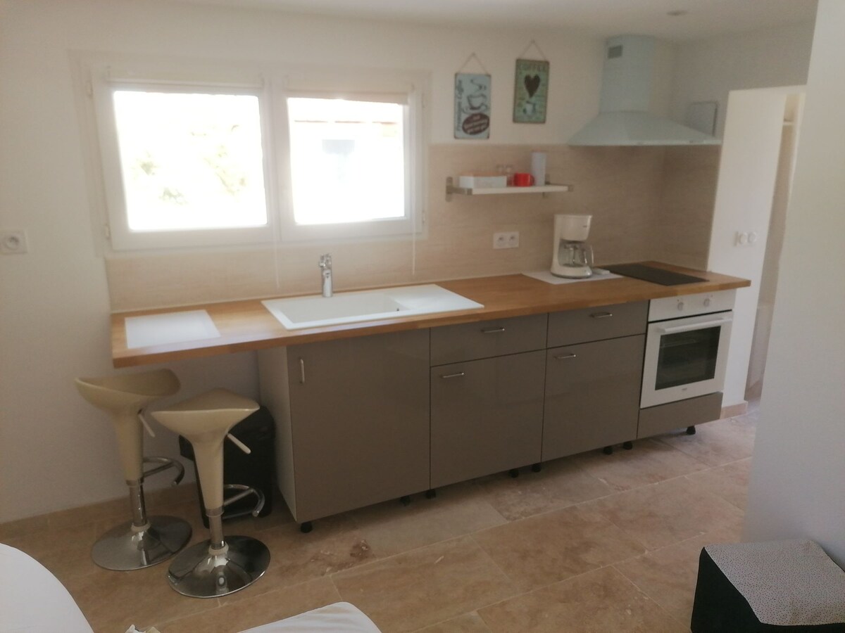 T2 de 50 m2 que se encuentra en la parte trasera de nuestra casa con entrada independiente y posibilidad de aparcar cerca de un barrio residencial situado en Laure, municipio de Gignac-la-Nerthe. El apartamento está totalmente climatizado. Aire acondicionado en la sala de estar. aire acondicionado arriba en la habitación. Cuarto de baño equipado con ducha, inodoro suspendido y lavabo. Arriba la habitación está equipada con una cama tamaño king de 180 cm y 2 cómodas. terraza de unos 30m² con mesa y barbacoa