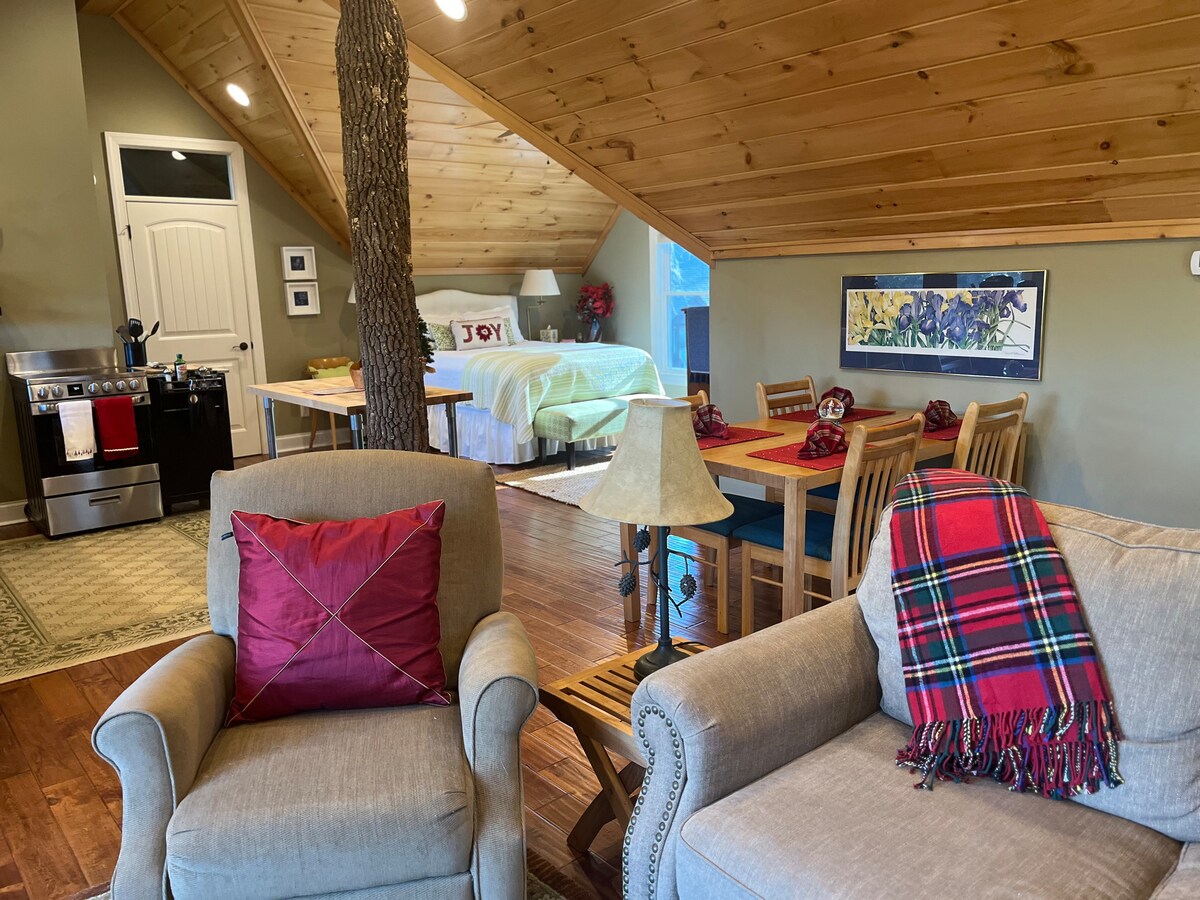 Welcome to Smoky Mountain Forest Bliss, your private creekside forest oasis just minutes from Maryville and a scenic drive to the Great Smoky Mountains. Nestled among towering trees and peaceful gardens, this secluded studio apartment offers creek views, a sun/moon deck, walking trails, fire-pit areas, fast Wi-Fi, a cozy queen bed, and a fully equipped kitchen. Perfect for couples, nature lovers, remote workers, and quiet retreat seekers, where comfort meets the calming rhythms of the woods.