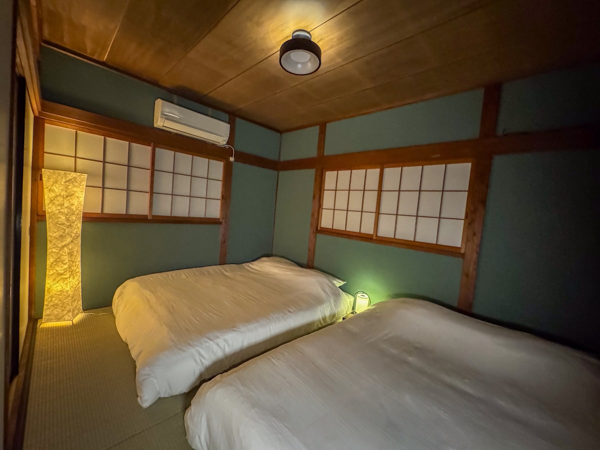 Una casa tranquila, totalmente renovada de estilo japonés en Matsubara, Osaka, a solo 10 minutos de la estación de Kawachi-Amami. Disfruta de acogedoras habitaciones con tatamis, camas tamaño queen, incienso de colores y un elegante interior perfecto para fotos. Equipado con un proyector y paneles de suelo LED, el espacio ofrece un ambiente fotogénico y de ensueño donde puedes relajarte y descansar con comodidad y tranquilidad. Tiene capacidad para 6 personas, ideal para familias o amigos que deseen una estancia tranquila cerca de Namba y Tennoji.