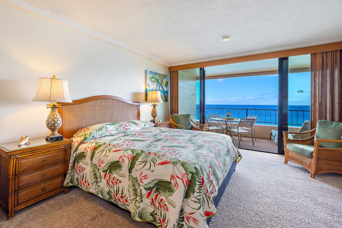 Planta superior, unidad de esquina, con impresionantes vistas al mar y a la montaña, a solo unos pasos de la playa. Mantente fresco con el nuevo aire acondicionado central. Observa miles de ballenas jorobadas, visibles desde el lanai. Observa enormes tortugas verdes varadas o sumérgete en el agua junto con ellas. Un dormitorio totalmente amueblado, 1 baño, lanai cubierto, cocina totalmente equipada, lavadora y secadora para todas tus necesidades de relajación. Piscina con jacuzzi y área de barbacoa/ pabellón y estacionamiento en el lugar.