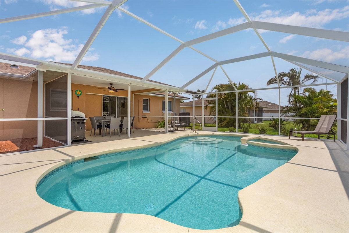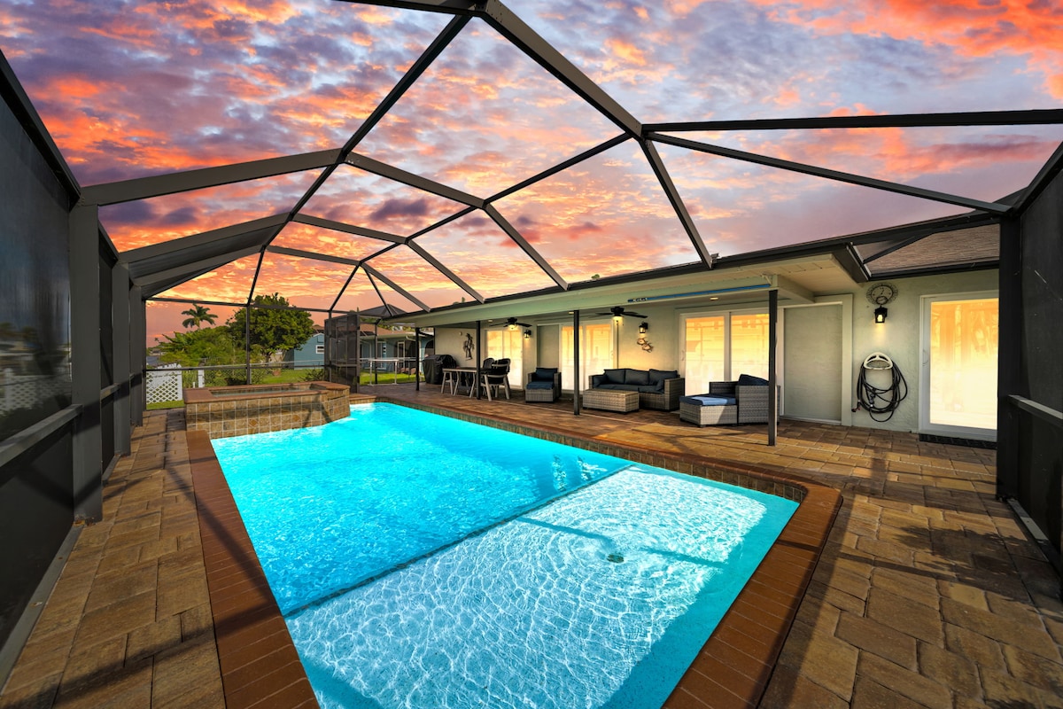 Escápate a este oasis de 5 dormitorios y 3 baños en el sistema de canales de Cape Coral, a pocos minutos en barco del golfo de México. Relájate en la piscina de agua salada cubierta de lanai y en el jacuzzi, rodeado de paisajes tropicales. Perfecta para familias, mascotas y viajes de negocios, la casa cuenta con una cocina espaciosa, varios televisores, TV por cable y vistas al agua. A solo 5 minutos de las playas, a 10 minutos de restaurantes y tiendas y a 35 minutos del aeropuerto de Fort Myers, ¡tu mejor escapada a Florida te espera! ¡Política de cancelación moderada y sin gastos de limpieza!