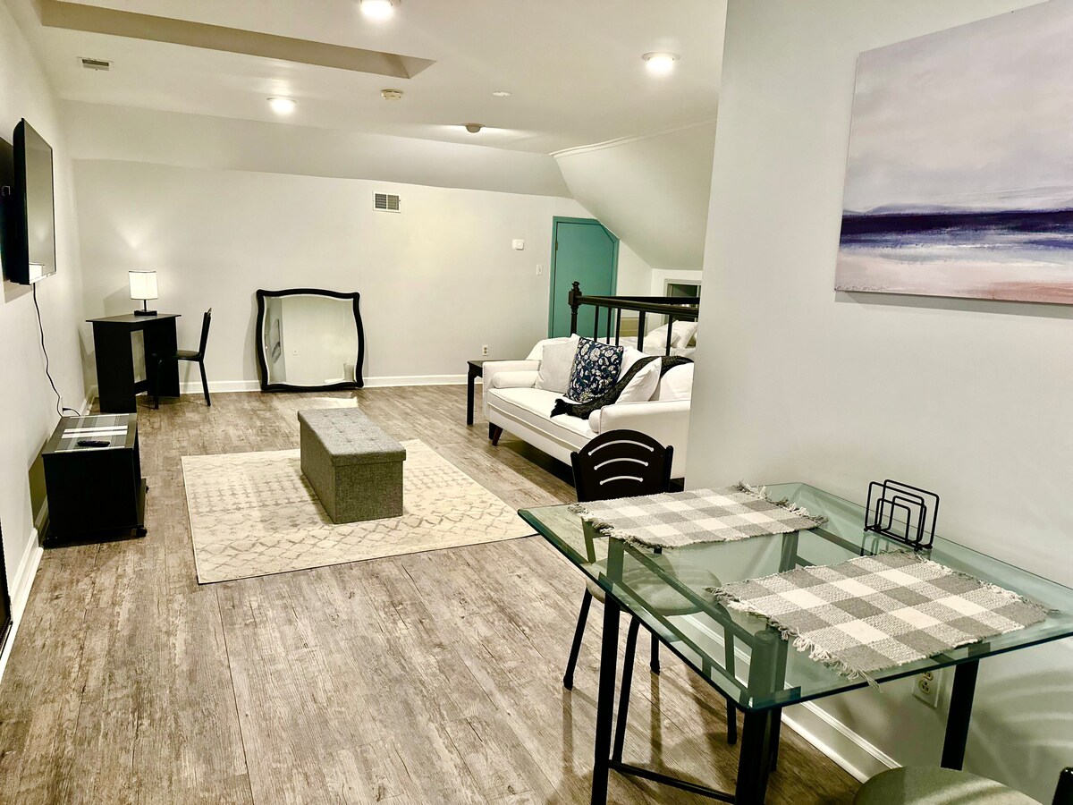 Bienvenido a su elegante y chic refugio en el Fourth Ward de Uptown Charlotte. Perfecto para una escapada romántica, un fin de semana con amigos, una escapada familiar o una estancia en solitario con estilo. Diseñado para la comodidad y la facilidad, está a minutos de restaurantes, cervecerías y vida nocturna de South End. Disfruta de la luminosa sala de estar con ventanales de suelo a techo, relájate en el lujoso dormitorio tamaño king, transmite tus favoritos en televisores inteligentes o cocina en la cocina completa. Explora la ciudad, vuelve a un espacio tranquilo y relájate.
