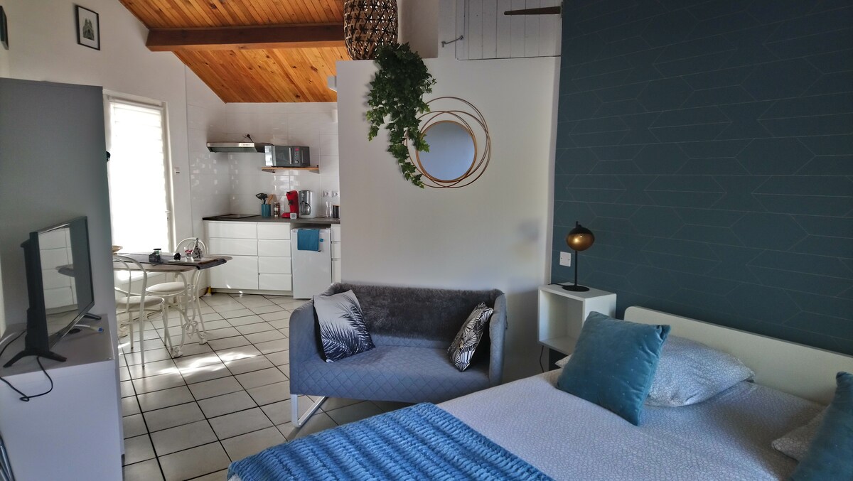 Espacio reformado, 35 m2: - gran dormitorio / sala de estar - cocina equipada independiente contigua - cuarto de baño con ducha + aseo Casa residencial tranquila, cerca del centro de la ciudad, supermercado. Su espacio está en la planta baja, nosotros vivimos arriba. La habitación da a una gran terraza a su disposición para los días soleados. Café - té - infusiones disponibles. Conexión WiFi NO FUMADORES - por favor, vaya a la terraza. ¡Estaremos encantados de asesorarle durante su estancia!