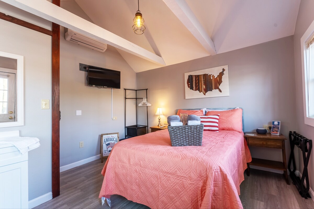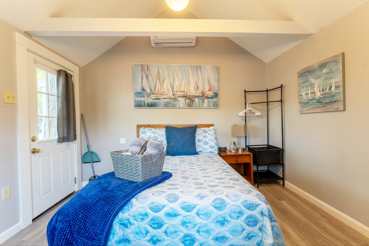 Cabaña de estilo Nueva Inglaterra, compacta y cómoda, es ideal para los huéspedes que pasan sus días explorando y quieren un refugio acogedor al que regresar. • Cabaña bellamente renovada con capacidad para 2 personas. • Se admiten mascotas • Terraza con vistas al lago - Wifi de cortesía • Televisión inteligente y altavoz bluetooth JBL • Acceso directo al lago (al otro lado de la calle) • Mininevera - Café, estacionamiento, kayaks y bicicletas de cortesía • A menos de 10 minutos a pie de restaurantes y atracciones locales.