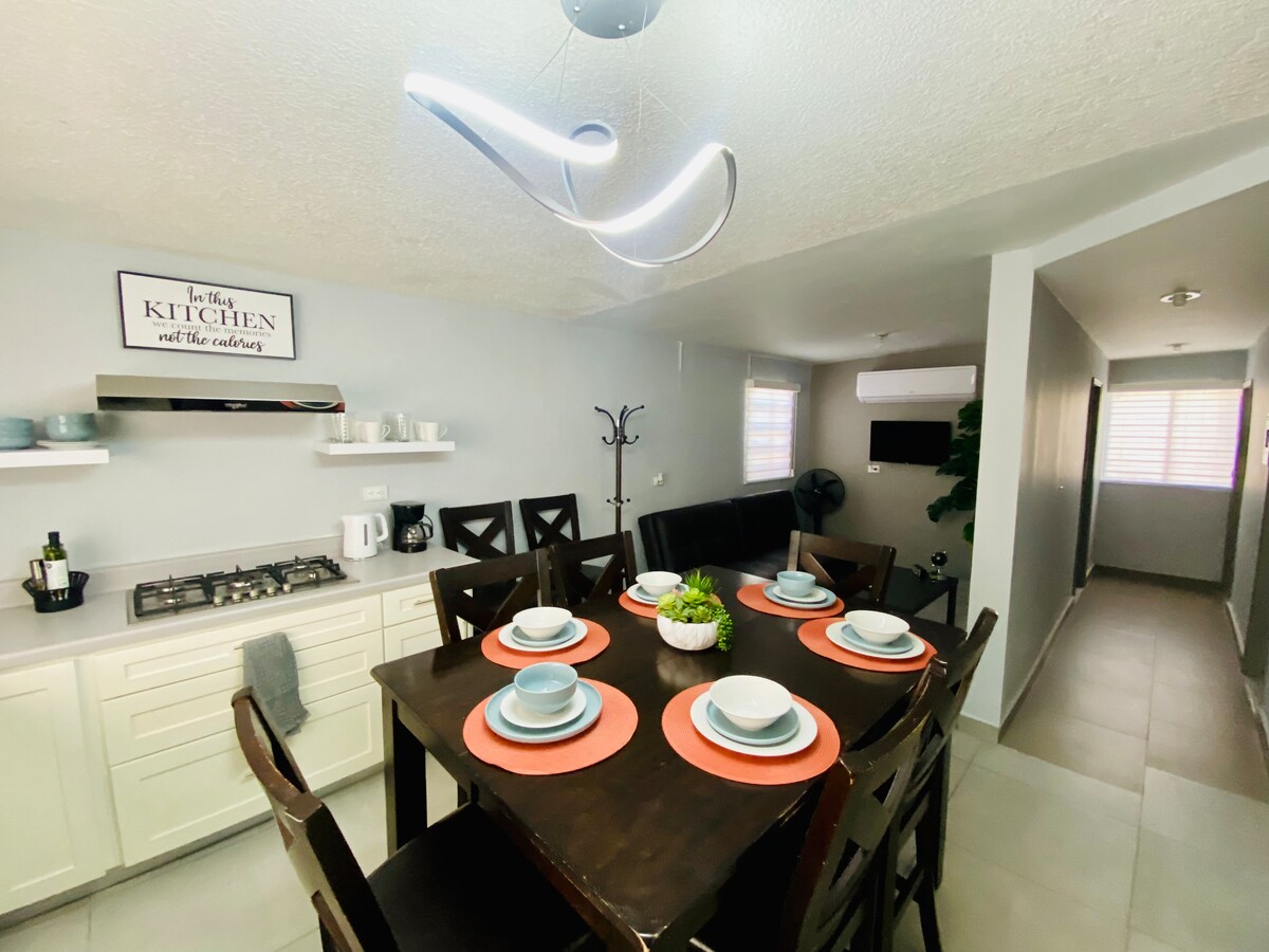 Relájate con toda la familia encontraras todas las amenidades, servicio café, una cocina equipada con loza, batería de cocina, cristalería, cubiertos, electrodomésticos y encimera de granito. Alarma con cámaras de circuito cerrado en el exterior de la propiedad. Wifi, Ethernet, Smart tv de 32" y 43", NETFLIX, A/C en recamaras y sala/comedor, centro de lavado, calentador de agua de deposito eléctrico, dos cómodos baños totalmente equipados