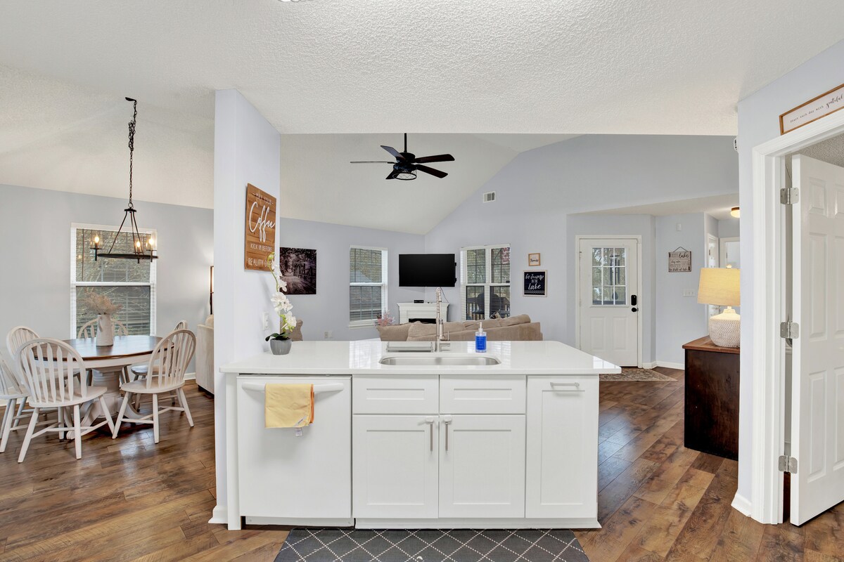 Welcome to our charming getaway located in a secure gated community. This property features a private dock and a refreshing swimming pool, perfect for relaxing after a day of adventures. Enjoy breathtaking sunsets from our dock, and feel free to bring your boat to explore the nearby waters or fish right off the dock! you'll find ideal for family outings. In the evenings, gather around one of our two fire pits, complete with firewood, for cozy nights under the stars.