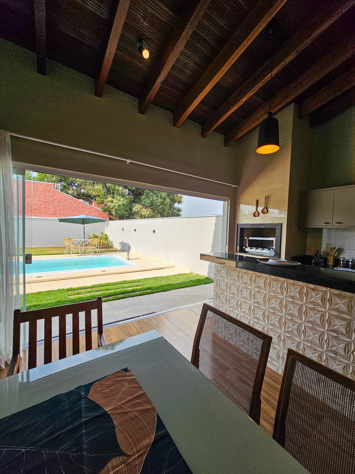 Hermosa y espaciosa casa, con decoración de estilo rústico. ¡La sensación de una casa de campo con la comodidad de la ciudad! Amplio patio con una maravillosa piscina, zona gourmet con barbacoa y mucha vegetación. Dos amplias suites con cama king-size, aire acondicionado, TV y salida independiente al balcón exterior, además de un dormitorio con dos camas king-size, una cama individual, TV, aire acondicionado y sala de estar. Baño social, comedor, sala de TV, cocina totalmente equipada, tres balcones, área de servicio.