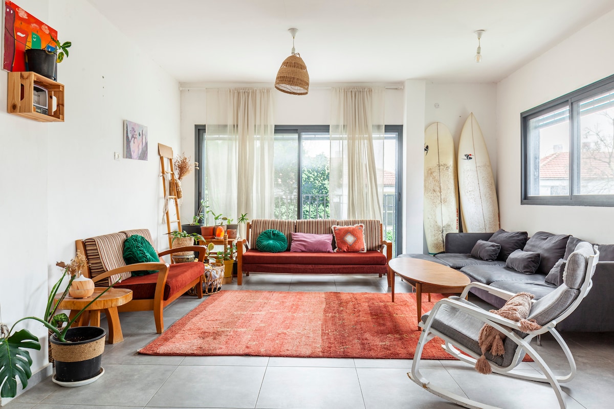 ¡Walla Esh! Este apartamento ático se encuentra en la parte sureste de Tel Aviv frente a un gran parque. Tiene 1 dormitorio con una cama tamaño queen, y la sala de estar tiene cocina, mesa de comedor, mesa de comedor, un televisor gigante y un futón. La mejor parte es el balcón gigante al aire libre en la azotea que tiene unas vistas espectaculares del parque. Hay un estacionamiento gratuito al lado del edificio. Convenientemente cerca hay una tienda de comestibles 24/7, por lo que siempre tendrás lo que necesitas. Muy cerca se encuentra Shuk HaTikva y muchos restaurantes que abren hasta tarde.
