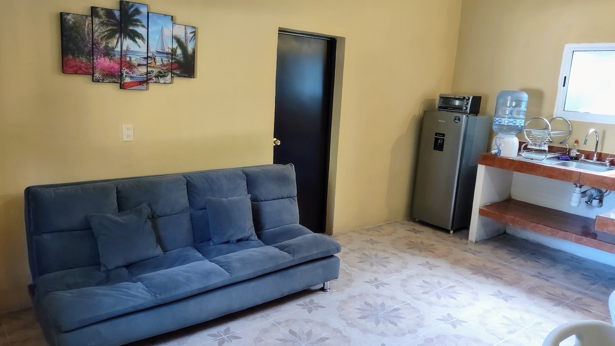 Estudio amplio, con la mejor vista de la bahía, de atmósfera relajante y natural, ubicado en una comunidad tranquila a solo 5 minutos de las más hermosas playas como Mismaloya, Palmares, Las gemelas, Colomitos, Quimixto, Yelapa las animas etc. ruta de camiones pasa frente de la casa para ir a cualquier punto de Vallarta, cocina amplia con refri, aire ac. y ventilador, un pequeño armario, hielera, sombrillas y kayak, si te gusta la pesca puedes pescar de orilla en la playa justo abajo el estudio.