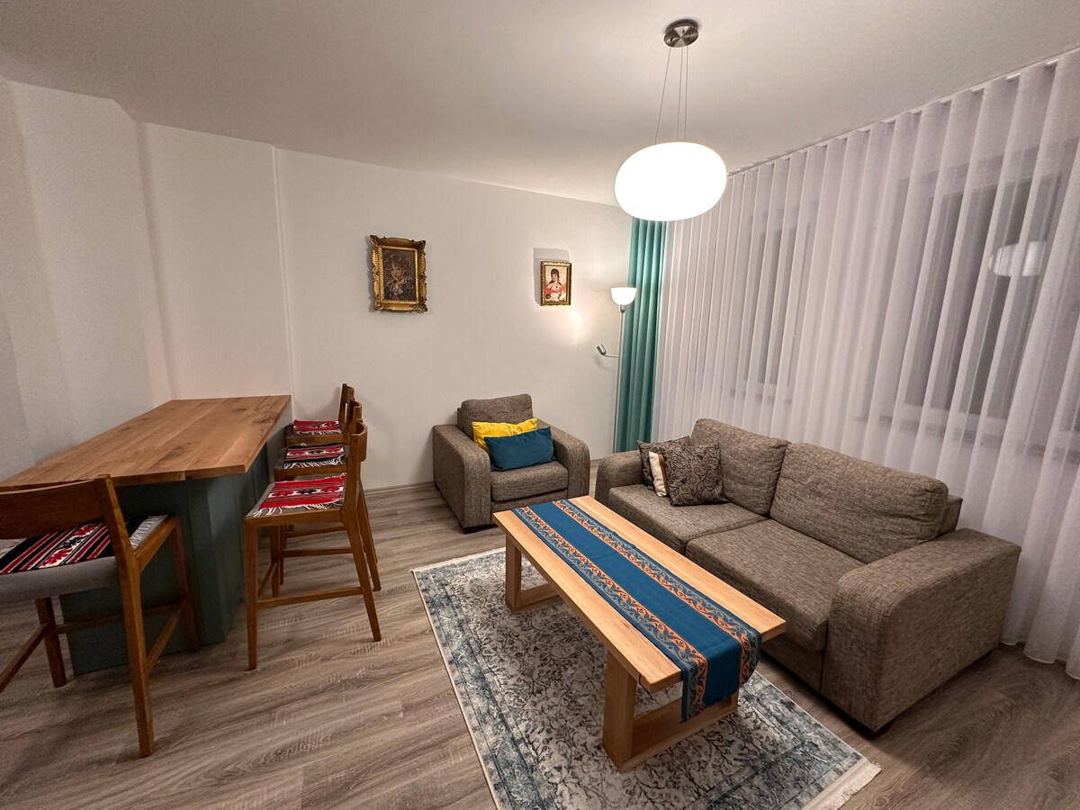 Stay cool with our new air conditioner! In the heart of Prishtina, just 10 mins from the main square, this bright apartment has a large terrace with city views, two modern bathrooms, three cozy beds, a fully equipped kitchen, and a spacious living room with comfy sofas and a 42" TV with Smart Box (Netflix,Hulu,Music) Perfect for relaxing, exploring, or working remotely in comfort and style!