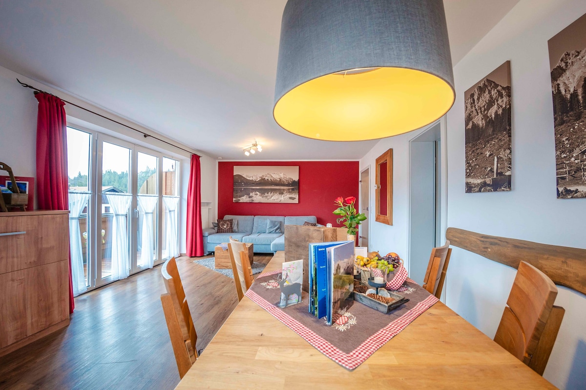 El apartamento con orientación sur ofrece una gran vista del mundo alpino de Karwendel y Wetterstein. Recientemente ha sido renovado y amueblado. Hay capacidad para cuatro personas, pero es ideal para dos o tres. El apartamento tiene casi 40 m2 de espacio habitable muy limpio: salón comedor (con una cocina americana amplia y totalmente equipada), dormitorio (con una cama doble ancha y colchones nuevos), baño privado con luz natural, balcón orientado al sur, plaza de aparcamiento privada.