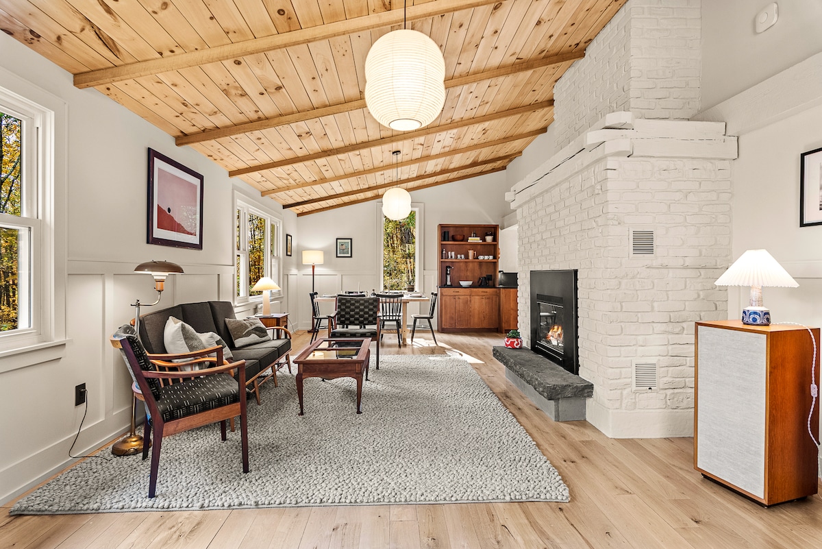 ¡Vistas vertiginosas del río Hudson! Dulce cabaña modesta en escala, sencilla y pura para no restar valor a la riqueza de las vistas, ofreciendo un sentido fresco y estimulante de justo lo que se necesita, nada más. El revestimiento primitivo y resistente se cosechó de los cedros del lugar; el interior de pino nudoso se obtuvo localmente. Los amigos regalaron una bañera con patas de garra y un fregadero de granja histórico. Disfruta de una experiencia opcional de jacuzzi en nuestro spa japonés o en nuestra encantadora sauna de cedro nueva. ¡Cerca de Gore y Garnet Hill!