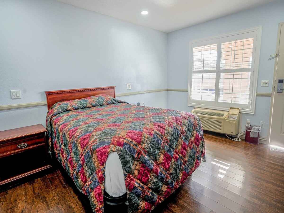 Habitación estilo B&B de Sierra Motor Lodge con cama tamaño queen nueva. Remodelado con muebles nuevos, escritorio, nevera pequeña y fregadero. Una habitación básica sin baño adjunto. Uso compartido de 4 baños en el pasillo. Cada sala de ducha es privada para 1 huésped a la vez, tiene una puerta con cerradura para la privacidad. Consulta otros anuncios para encontrar habitaciones y suites de hotel más grandes. Convenientemente ubicado en McDonalds, Starbucks, Denny 's, Stater Bros Market. NOTA: Las habitaciones 200-225 se encuentran en el segundo piso, solo en minúsculas. Envía un correo electrónico a Airbnb para solicitar el primer piso si está disponible.