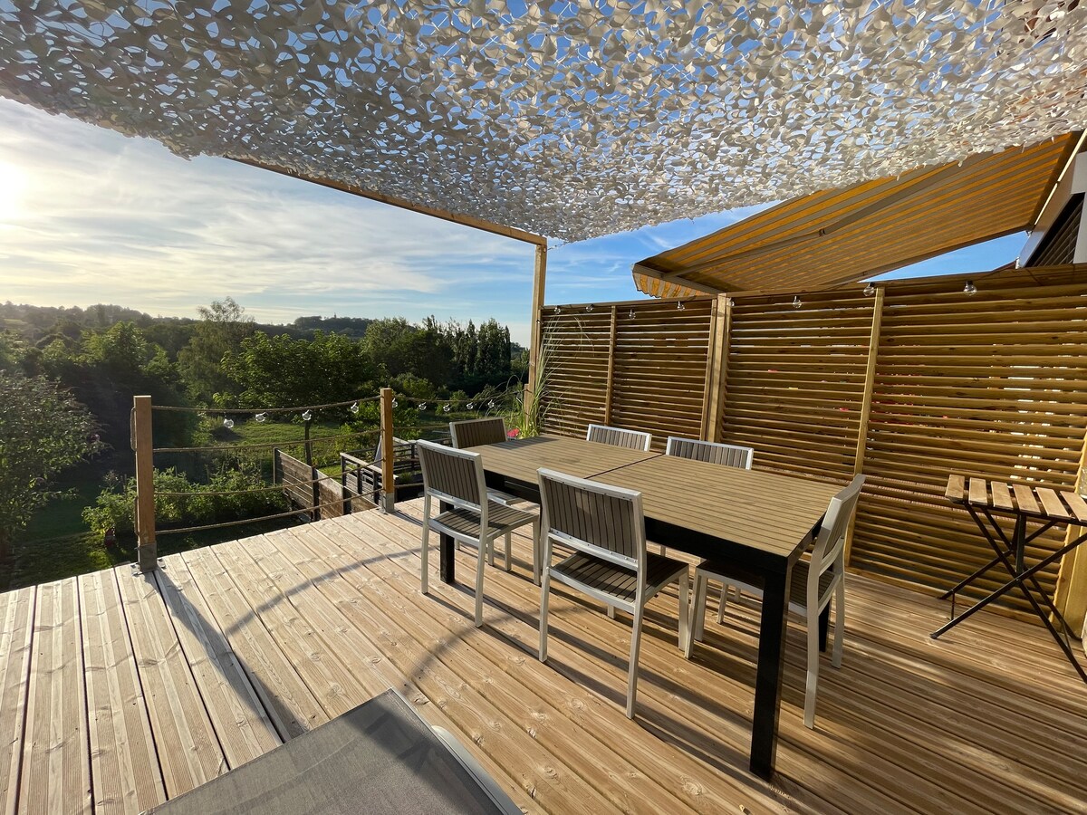 La casa de «la Grenouillère» es una vivienda unifamiliar contemporánea de madera, con todas las comodidades, que se encuentra en un entorno ajardinado de calidad, a orillas de un estanque natural. Una hermosa terraza con vistas al estanque, poblado de ranas, donde las libélulas revolotean constantemente alrededor de los lirios de agua y los nenúfares. No hay mosquitos, ¡las ranas y los pipistrellus se encargan de ello!