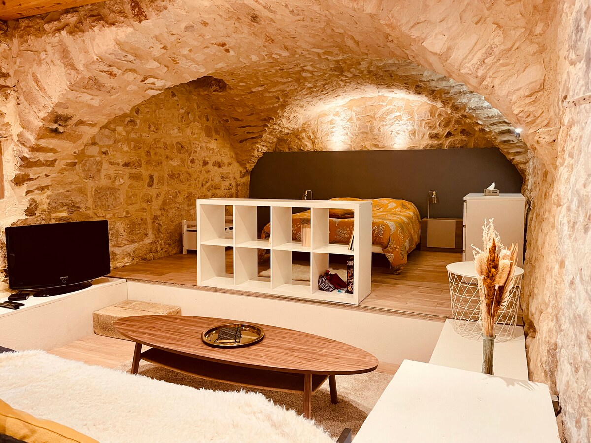 Entre el mar, los viñedos y la garriga, a 10 minutos de Montpellier, se alquila un antiguo granero de piedra completamente restaurado en el pueblo medieval de Murviel Lès Montpellier. Alojamiento para 2 personas. - salón comedor con cocina equipada (nevera, microondas/horno, vajilla, cafetera Senseo, ...) - dormitorio con cama de 140*190, TV, armario, sillón - cuarto de baño con lavabo, ducha, inodoro, armarios. Se proporcionan toallas y sábanas. La piscina es un espacio compartido con nuestra familia.