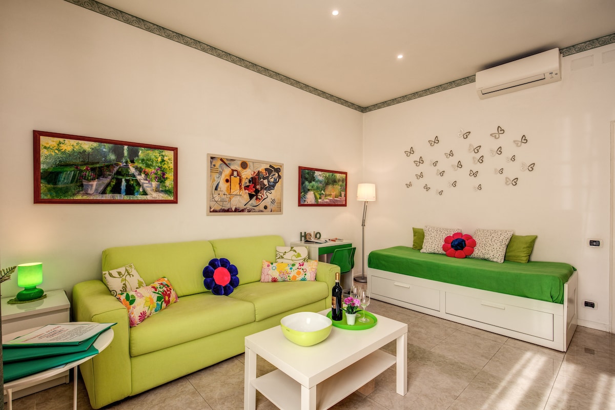 Luminoso apartamento situado en la 5ª planta de un edificio de principios del siglo XX con vistas al acueducto de Nerón, distribuido en 3 ambientes: una romántica y espaciosa habitación doble con cabina de ducha a la vista; un amplio cuarto de baño con acabados de travertino, dotado de lavabo doble, inodoro y bañera de hidromasaje; y una sala de estar con cocina americana y un cómodo sofá que se convierte en una verdadera cama doble.