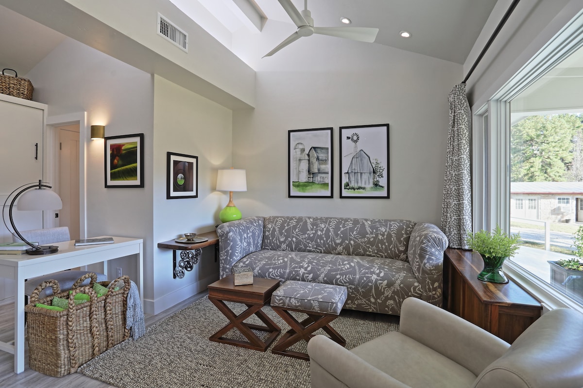 En un refugio rural privado de 14 acres, esta pequeña casa ofrece una experiencia de alojamiento inolvidable. Nuestra innovadora casa Cargo está equipada con comodidades de primera categoría, como un colchón tamaño queen de 14 pulgadas con sábanas de lujo, TV inteligente, porche delantero privado, estacionamiento conveniente, wifi gratuito, cocina completamente equipada, cafetera Keurig y mucho más. La mejor parte de esta unidad es nuestra terraza en la azotea, donde podrás disfrutar de una cena romántica, contemplar las estrellas o tomar una taza de café por la mañana.
