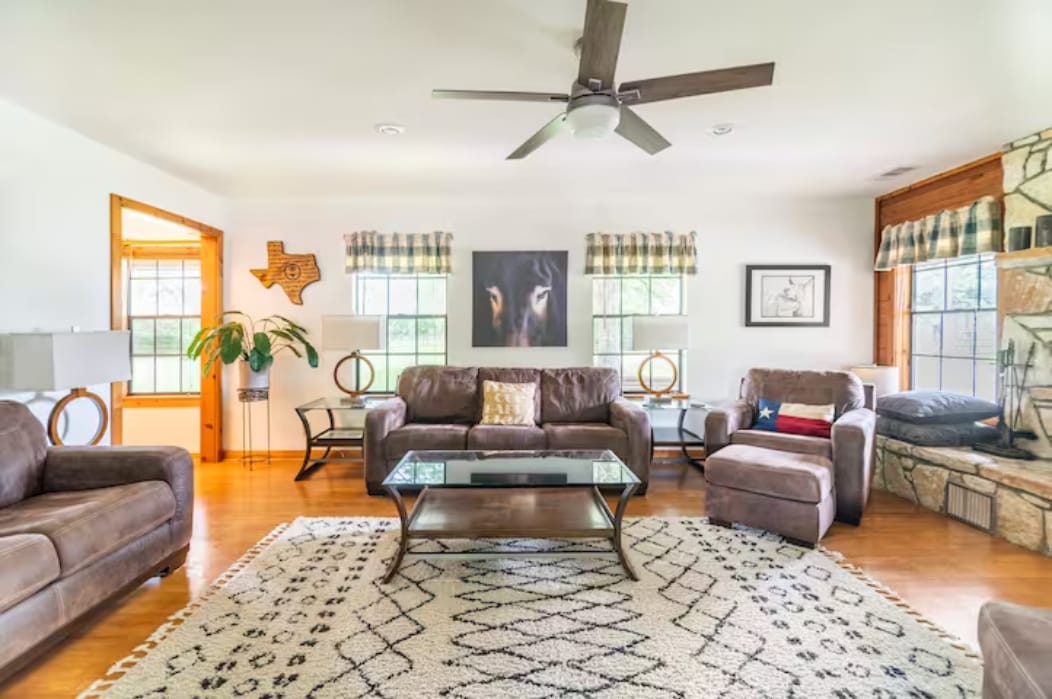 ¡Te damos la bienvenida a Prancing Horse Estates! Esta es una finca privada cerrada de 10 acres con piscina privada, spa y cascada + casa de 4 dormitorios. Te encantará si te gusta el estilo interior de lujo combinado con un hermoso espacio al aire libre. 10 acres, 4 prados y 6 densamente boscosos con 2 caminos a lo largo del arroyo, con un hermoso espacio junto a la piscina con capacidad para mayores de 16 personas. Biblioteca bien equipada, sala para niños, juegos en el interior/exterior. Sitio certificado de Wildlife Habitat® con la National Wildlife Federation y Texas Conservation Alliance.