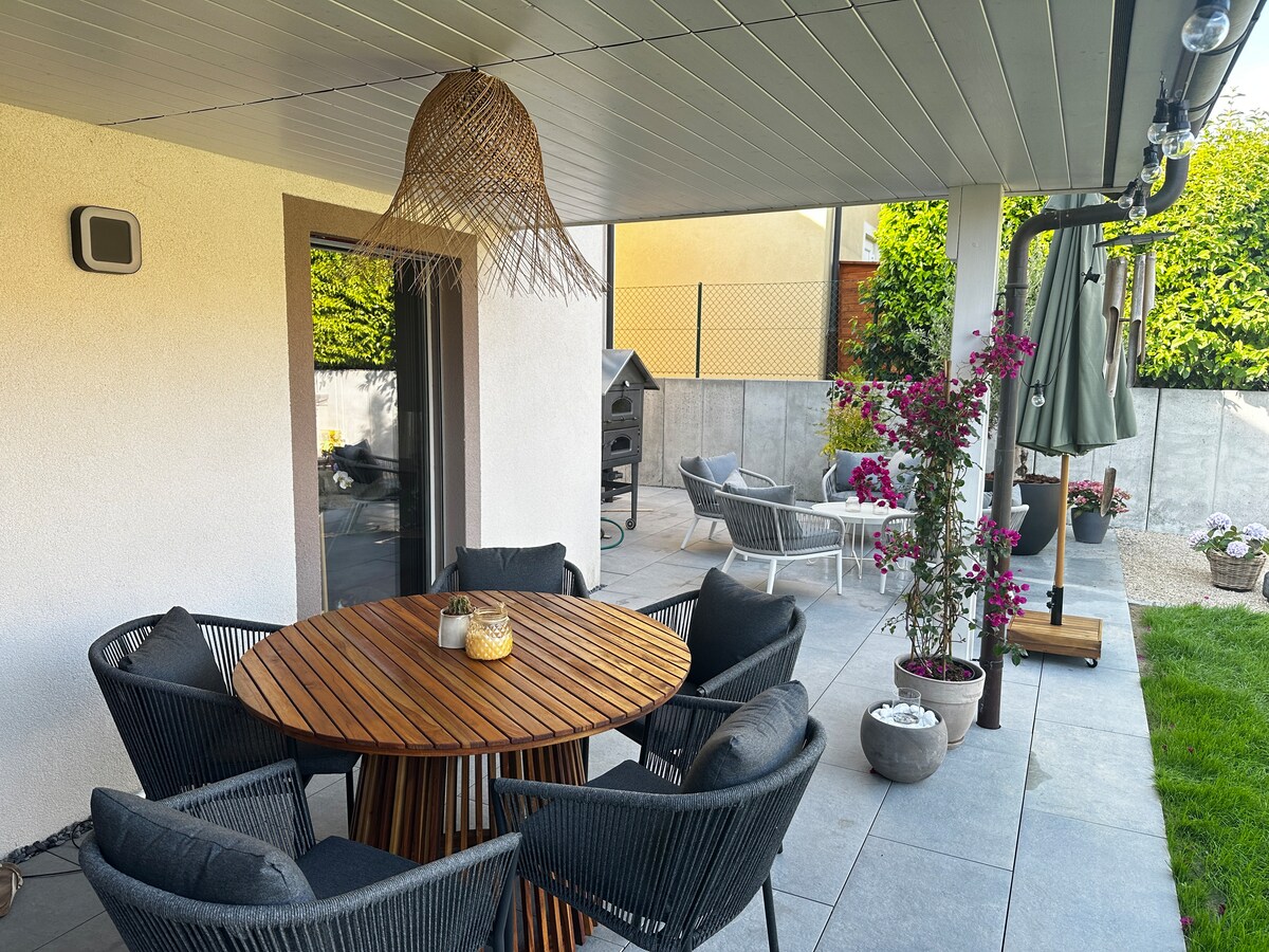 Notre villa est située à 20 min en voiture de Genève dans un village bucolique. Elle a été construite en 2020 et bénéficie de toutes les commodités modernes dont vous souhaitez profiter de nos jours. Elle peut accueillir jusqu'à 6 personnes avec 3 chambres, 3 salles de bains, un sauna, un jacuzzi avec vue sur le Mont-Blanc et un jardin et terrasse très agréable avec pergola et barbecue.