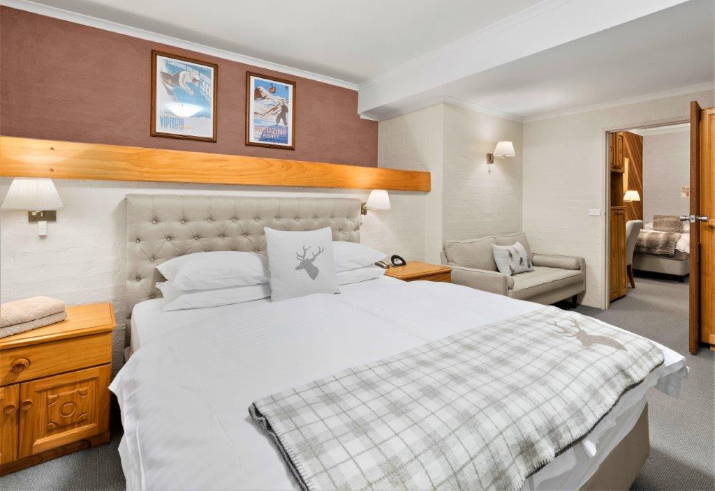 Family Quad rooms are larger style hotel rooms accommodating a maximum of 4 persons. The bunk is situated in the entry room whilst the king bed is in the main room. This room does not have a view. After a day on the slopes, retreat to your room, where rich timber accents, plush furnishings, and soft ambient lighting create a cosy, gemütlich atmosphere. BEDDING 1 x king bed and one bunk OR by request: 2 single beds and one bunk RATES Room rates include full buffet breakfast for each guest.