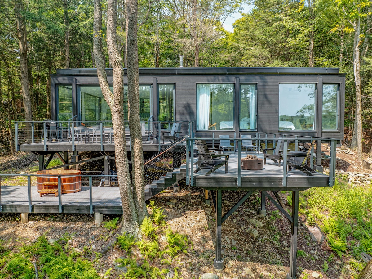 Déjate cautivar por el ambiente acogedor que combina a la perfección la esencia nostálgica de un campamento de la vieja escuela con la sofisticación elegante del diseño contemporáneo. A medida que te acercas, el fuego te invita a reunirte alrededor y disfrutar de su tranquilidad. Imagina hundirte en el burbujeante jacuzzi, disfrutar de una bebida mientras contemplas el cielo estrellado y dejas que el estrés de la vida cotidiana se desvanezca. Este es el tipo de experiencia rejuvenecedora que te espera en este oasis de Pocono.