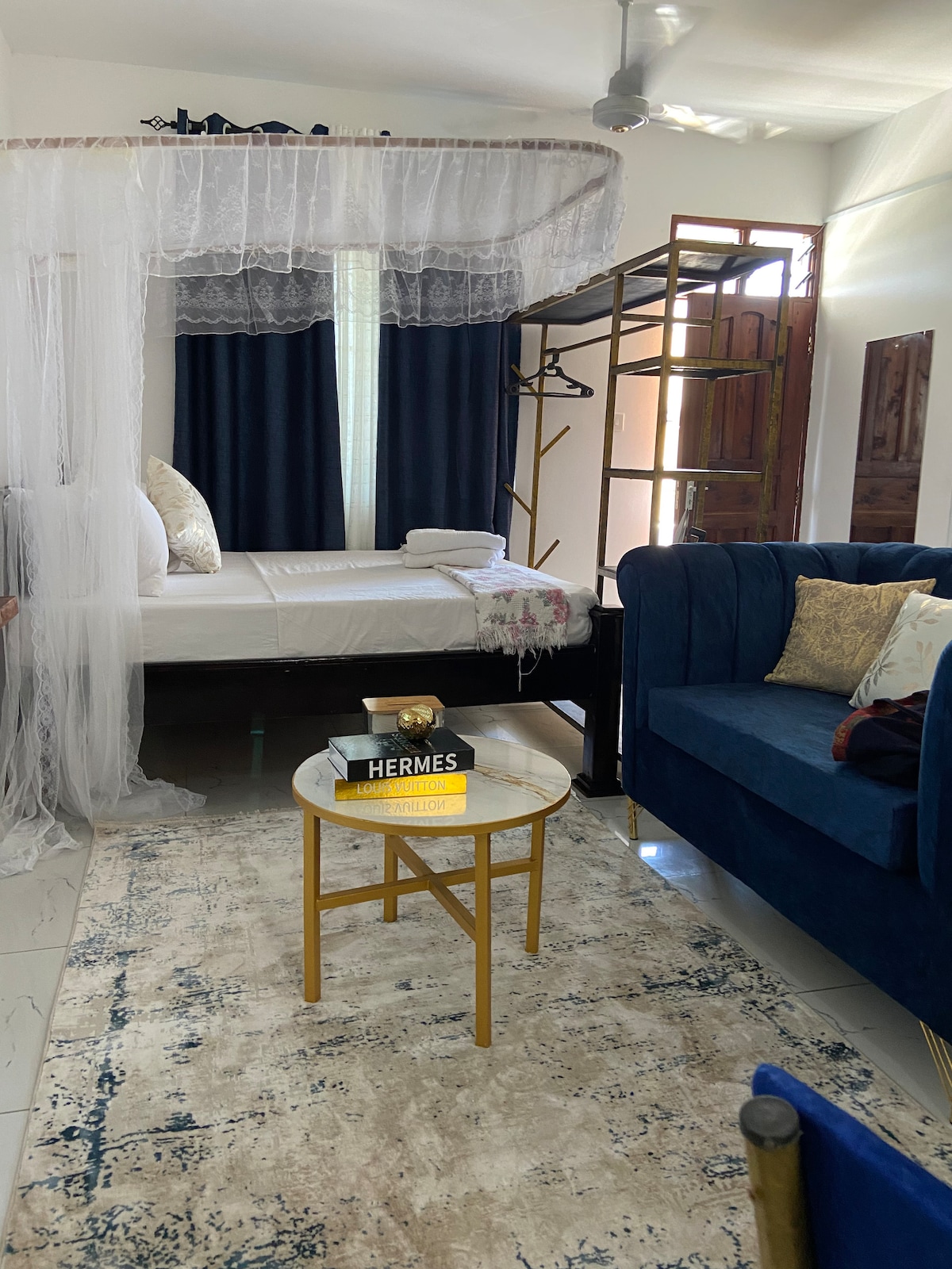 Acogedor apartamento estudio con servicios (Bamburi) amueblado. * Adecuado para 2 adultos y 1 niño o 3 adultos, amueblado con una cama tamaño queen y una cama individual. * Incluye aseo diario. * Mesa de comedor con cuatro sillas, sofá, mesa de centro. * Aire acondicionado *TV * Caja fuerte con llave * Balcón con dos sillas y mesa de centro * Cocina: nevera, microondas, hervidor de agua, cafetera, tostadora, vajilla y cubiertos. * Acceso a servicios: piscina, zona de juegos para niños, bar de playa, restaurante, gimnasio, playa, lavandería. * A 21 km del aeropuerto internacional de Moi. * A 26 km de SGR Mombasa.
