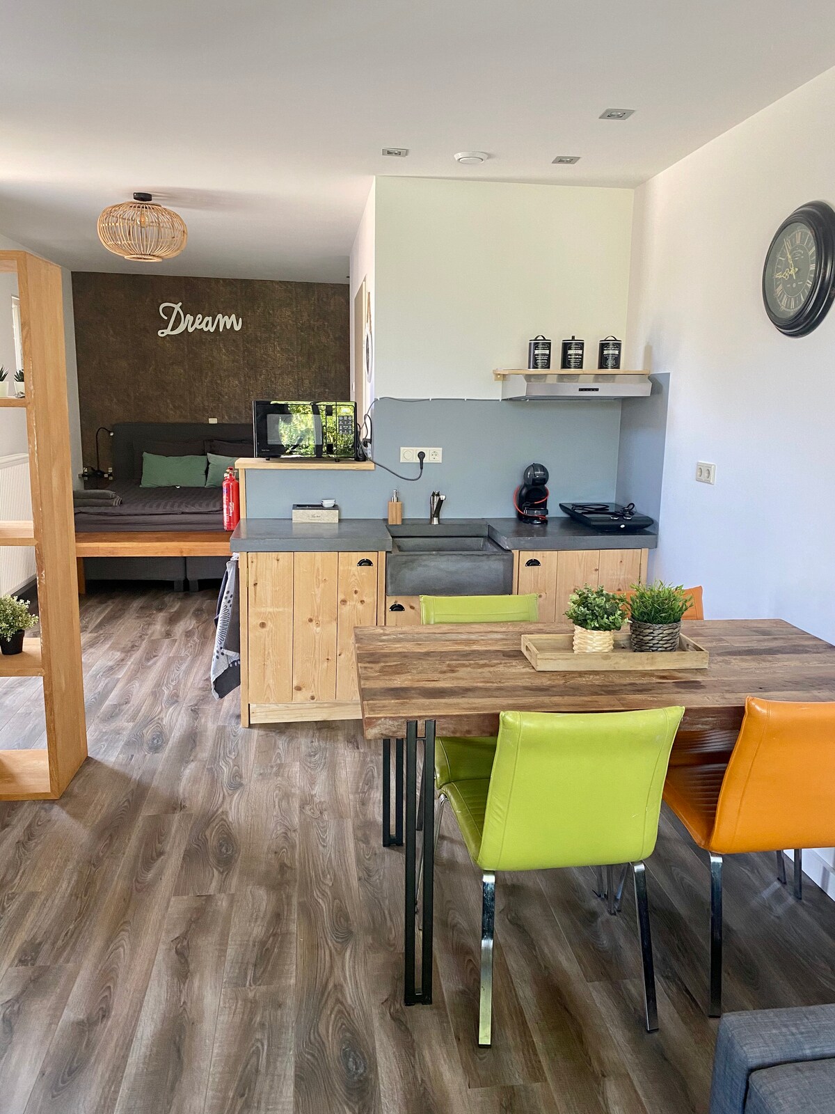 Situado en el campo, un estudio luminoso y moderno con vistas increíbles. El estudio cuenta con una cama tamaño queen, baño y aseo separado. Con aire acondicionado. Está decorado con arte moderno y detalles vintage. Desde el estudio saldrás a tu terraza privada. El estudio ofrece café y té gratuitos, así como wifi gratuito. El desayuno está disponible bajo petición (12,50 € por persona). Situado a 25 minutos de Ámsterdam. Ten en cuenta que el estudio es más accesible en coche.