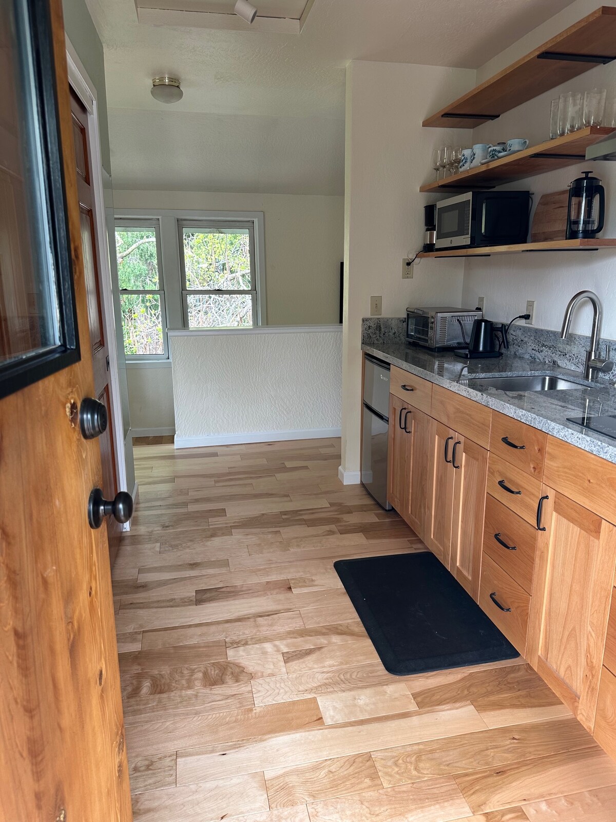 Wake up in the trees with light pouring through nine windows, overlooking the Sierra foothills. Walk into historic downtown in minutes, with its cafes, restaurants, and small shops. Merry's Garden Suite, located in a lovely quiet neighborhood, is designed with comfort, ease, and functionality in mind. The nine windows in the bedroom afford gorgeous, sweeping views of the foothills. A bathroom with a walk in shower and jacuzzi tub, and a beautifully outfitted new kitchen complete the suite.