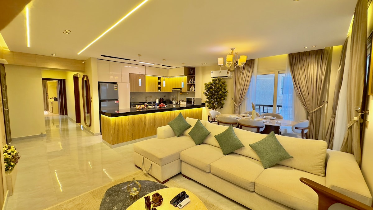 Disfruta del lujo boho moderno en este nuevo apartamento (octubre de 2025) ubicado en la prestigiosa West Golf Extension, New Cairo, a pocos minutos de 5A Walkway, Cairo Festival Mall y los vibrantes lugares de Katameya. Disfruta de un dormitorio principal presidencial, 4 televisores inteligentes, aire acondicionado oculto, persianas eléctricas y electrodomésticos completamente nuevos en un espacio luminoso y elegante. Perfecto para los huéspedes que buscan comodidad, estilo y una experiencia de lujo en El Cairo.