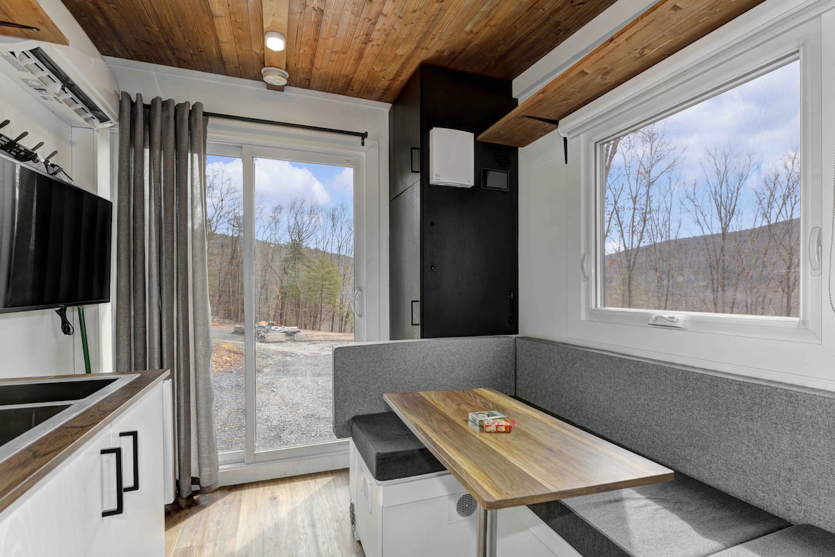 Modern farmhouse tiny home on the Delaware River with stunning views spanning 1 mile in either direction of the mighty Delaware and bald eagles. This 4 season tiny home features AC and heat with a dinette in the kitchen for 4 that can be turned into a bed for two children or one adult. Refrigerator, oven, and microwave round out this kitchen. The bathroom includes a flush toilet, sink, and shower. The bedroom has a queen size memory foam mattress and big windows to hear the rushing water.