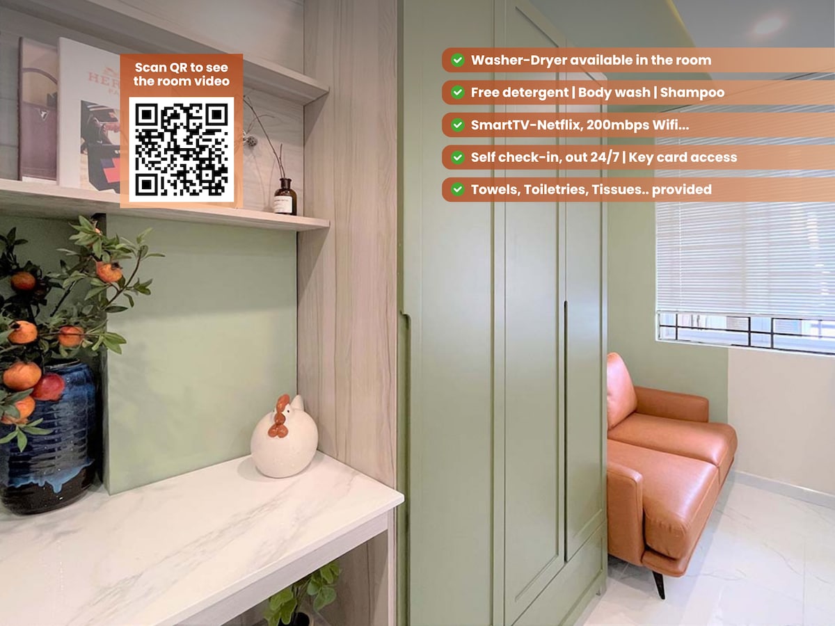 Nuestro estudio está a solo 2 minutos a pie de Bui Vien, a 5 minutos de Ben Thanh y MRT. La mayoría de los puntos de acceso, cafés y restaurantes están cerca. Adecuado para huéspedes que deseen explorar el centro de la ciudad a pie. ¿Por qué te va a encantar? 🌆 Gran balcón con barra, silla alta y mesa para trabajar y relajarse al aire libre. 💻 Smartdesk y wifi ultrarrápido (siempre por encima de 500 Mbps) Lavadora y secadora🌀 privadas, además de purificador de agua potable Proyector de🎬 100" con Netflix, YouTube y TV de 48" como pantalla adicional