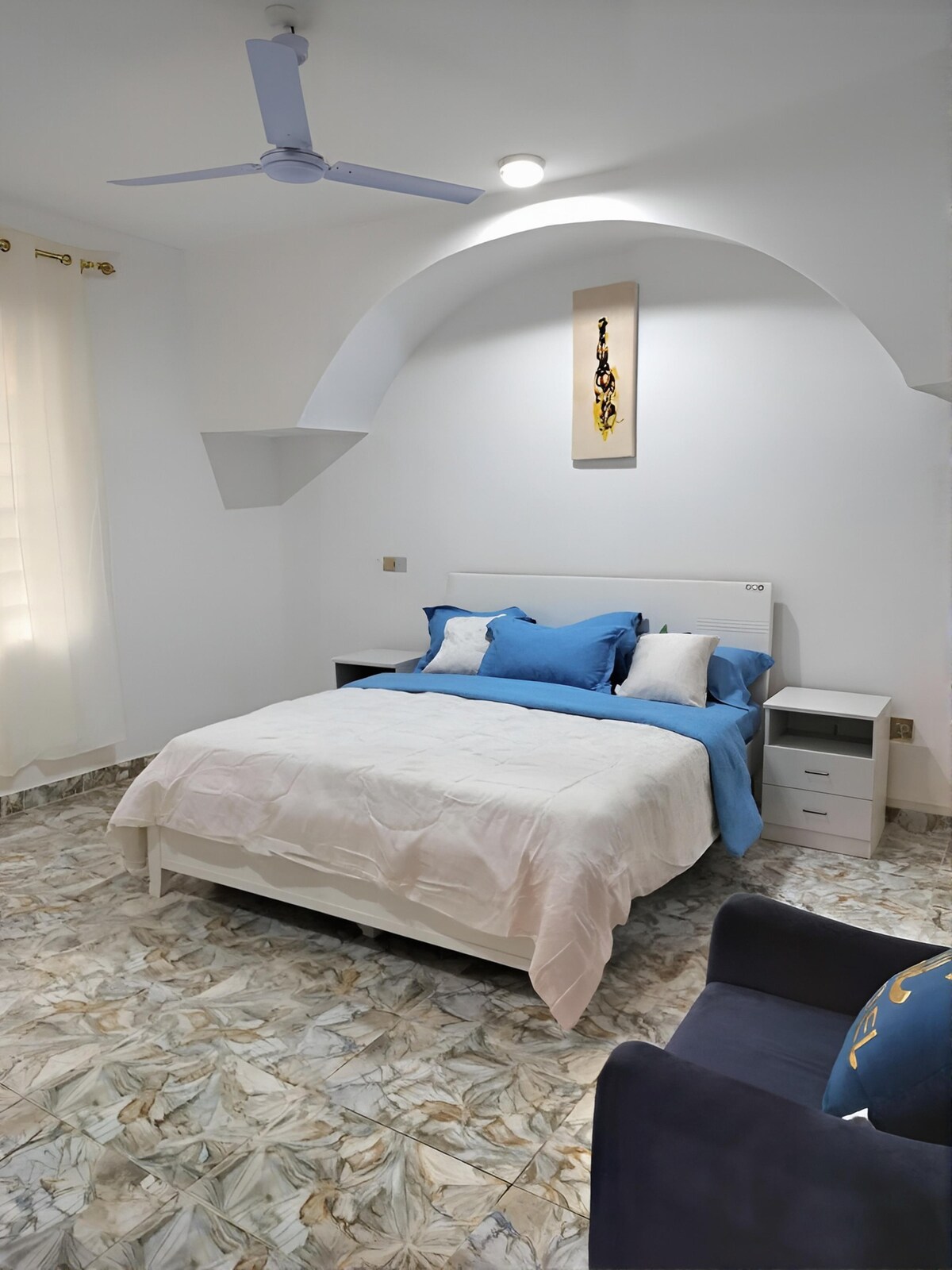 Relájate en este sereno y elegante apartamento de un dormitorio con cocina de planta abierta y sala de estar. Ofrece todo lo necesario para una estancia cómoda y proporciona una escapada tranquila desde el centro de Accra. A solo tres minutos en coche del City-Escape Hotel y a cinco minutos de la playa de Prampram, es perfecto para trabajar a distancia o para una escapada con tu pareja o amigos. Este espacioso apartamento independiente está totalmente amueblado con los últimos electrodomésticos y servicios.