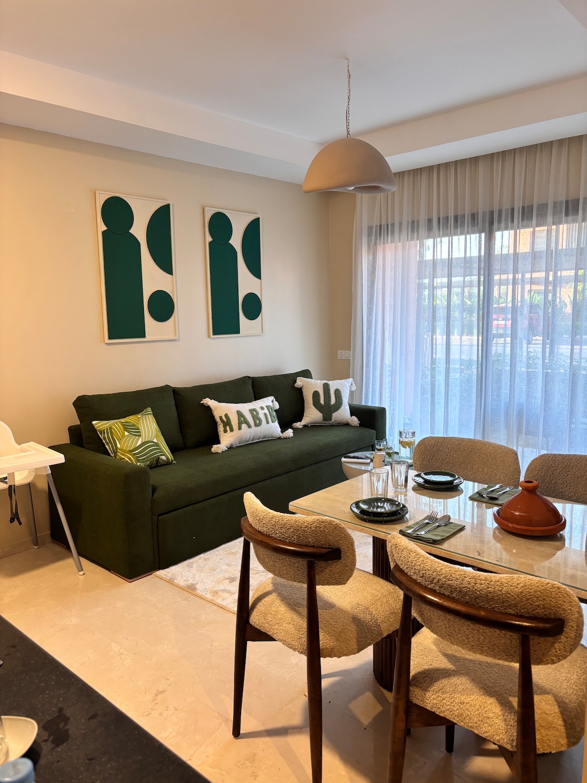 Relájate en este luminoso apartamento de 1 dormitorio totalmente equipado ubicado en Domaine de Noria en Marrakech, a solo 10 minutos en coche del aeropuerto y a 15 minutos de Medina y Hivernage. Perfecto para parejas o familias pequeñas. Servicios: Toallas + sábanas Cama tamaño queen + Sofá cama Cocina completa Piscina Wifi de alta velocidad (fibra óptica) y 2 televisores Balcón Aire acondicionado Aparcamiento privado con seguridad 24/7 Jardín y parque infantil A 4 minutos a pie de una de las mejores panaderías y cafeterías de la ciudad Cuna (disponible previa solicitud)