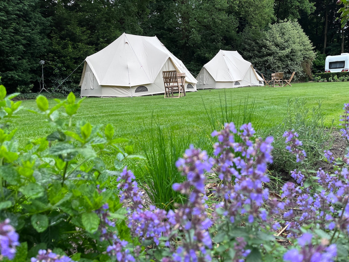 Alójate en una de nuestras propiedades en el verde en el borde del bosque de los hermosos bosques de Lierop. Tiendas de campaña bell tent lujosamente amuebladas para 2 personas. Tu cama se puede calentar con una manta eléctrica En nuestra propiedad encontrarás un lujoso edificio sanitario y una sauna. La cocina al aire libre compartida tiene las necesidades básicas para cocinar. Hay nevera, congelador, fogones y una máquina Nespresso. Hay un acogedor lugar al aire libre donde se puede hacer un picnic y una barbacoa.