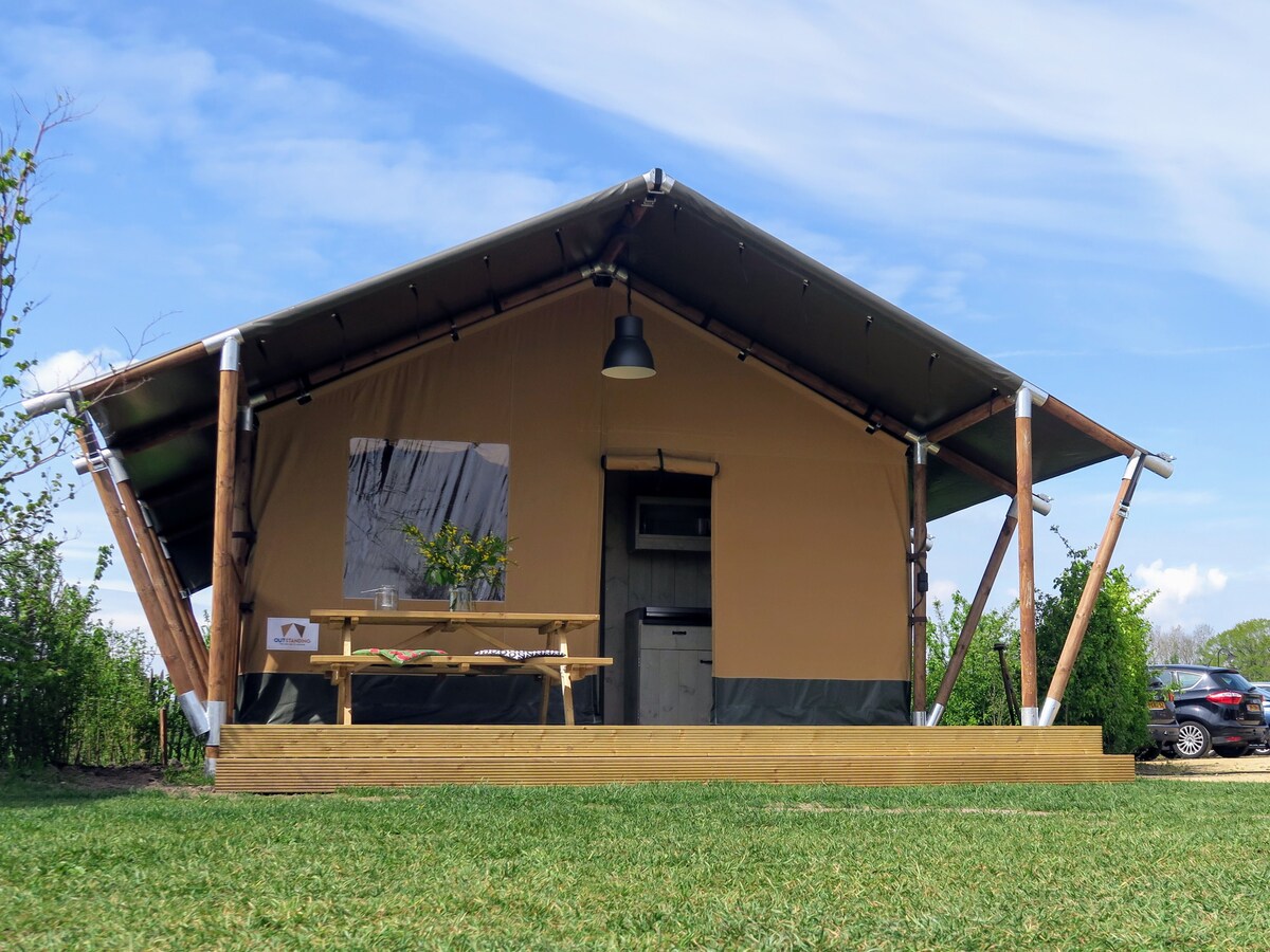 Tienda de campaña de safari de lujo en el tranquilo mini camping Petit013. Estamos comprometidos con la hospitalidad, el lujo y la comodidad. La tienda tiene su propio baño de lujo con ducha, lavabo e inodoro. La cocina está completamente amueblada con vajilla, utensilios de cocina y toallas de cocina. Hay ropa de cama por persona y las toallas de baño están listas (incluidas en el precio). Ven y disfruta de la paz y la tranquilidad. Despertarse por la mañana bajo el sol en la terraza. Por la noche, una copa al sol de la noche en el asiento detrás de la tienda.