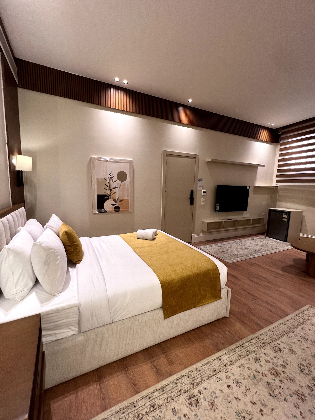 ¡Te damos la bienvenida a tu escapada perfecta! Disfruta de la comodidad en nuestro apartamento de dos dormitorios recién amueblado, con una cocina totalmente equipada y una amplia sala de estar con TV inteligente de 55 pulgadas. ¡Mantente conectado con internet de alta velocidad! Situado en el corazón de Nuevo Cairo, a pocos pasos de Waterway Boulevard y de las atracciones cercanas. ¡Reserva ahora para una estancia inolvidable en nuestros elegantes apartamentos con servicios!