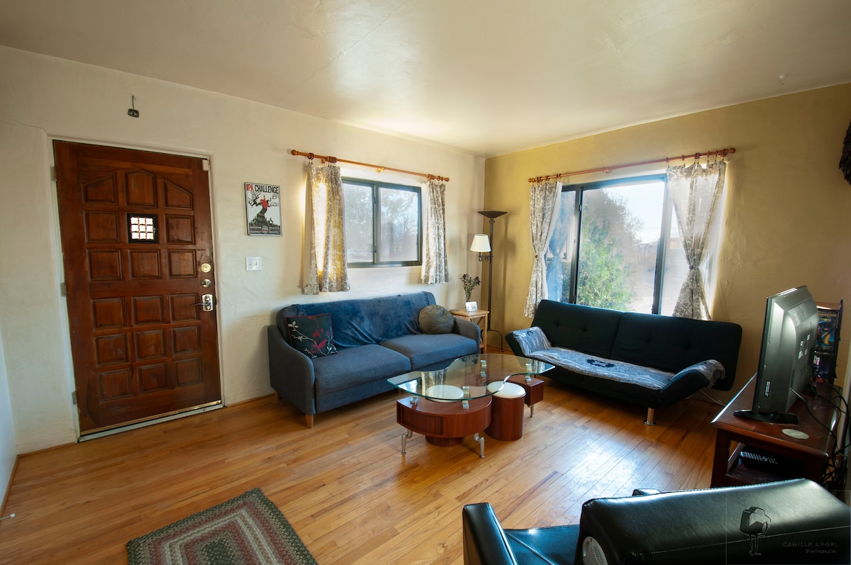 Relájate y desconecta en este alojamiento recién renovado y elegante. La casita está decorada con el encanto del nuevo México y detalles modernos. El dormitorio incluye una nueva cama tamaño queen y también hay un colchón de espuma tamaño queen plegable en la sala de estar. La mesa del comedor tiene capacidad para cuatro personas. El porche trasero es un pequeño oasis donde podrás disfrutar de un momento de tranquilidad o de una comida. Los grupos más grandes también pueden reservar la casa de al lado.