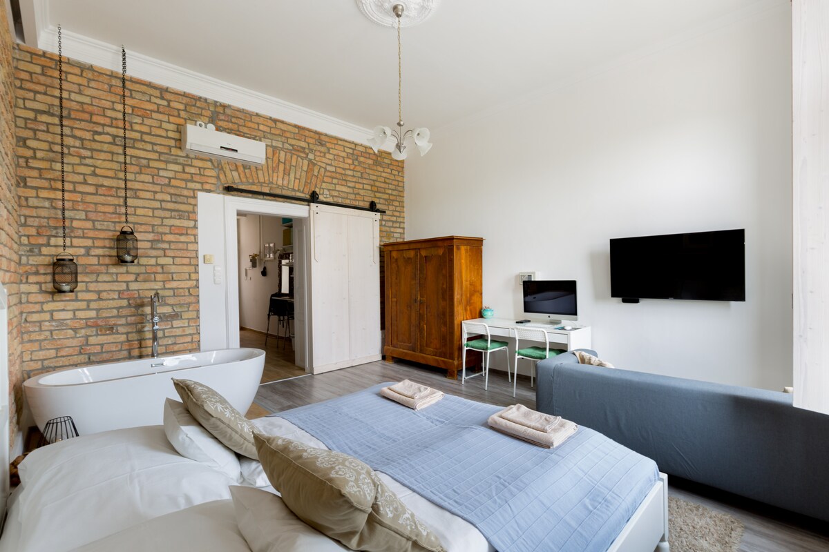 Nuevo Studio, private bathroom y kitchenette. En el centro, junto a Shopping street y la Central Market Hall Cuatro estudios individuales en el centro con cama queen y sofá cama, baño privado con ducha e inodoro, A/C, wifi gratuito de alta velocidad, TV y Netflix. Vestíbulo común con cocina totalmente equipada con horno, placa de 4 fuegos, lavavajillas, lavadora y secadora. El Danubio, restaurantes, cafeterías, tiendas, metro y tranvía están a la vuelta de la esquina.