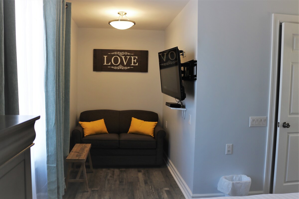 Púrpura. El púrpura es el color de Grooviness. (Según un pequeño ser humano favorito; ) Esta espaciosa suite cuenta con una cama tamaño queen con ropa de cama Luxe, baño moderno con bañera, acogedoras batas de baño y productos para el cabello y el cuerpo de alta gama. Área de estar con TV de 39pulgadas. FibreOP Wifi & Wireless Charging Pad. Obras de arte locales, corredora de cama personalizada y almohadas de la artista textil local Valerie Levy. Cubo de hielo, copas de vino y sacacorchos. Aire acondicionado, restaurante en el lugar.