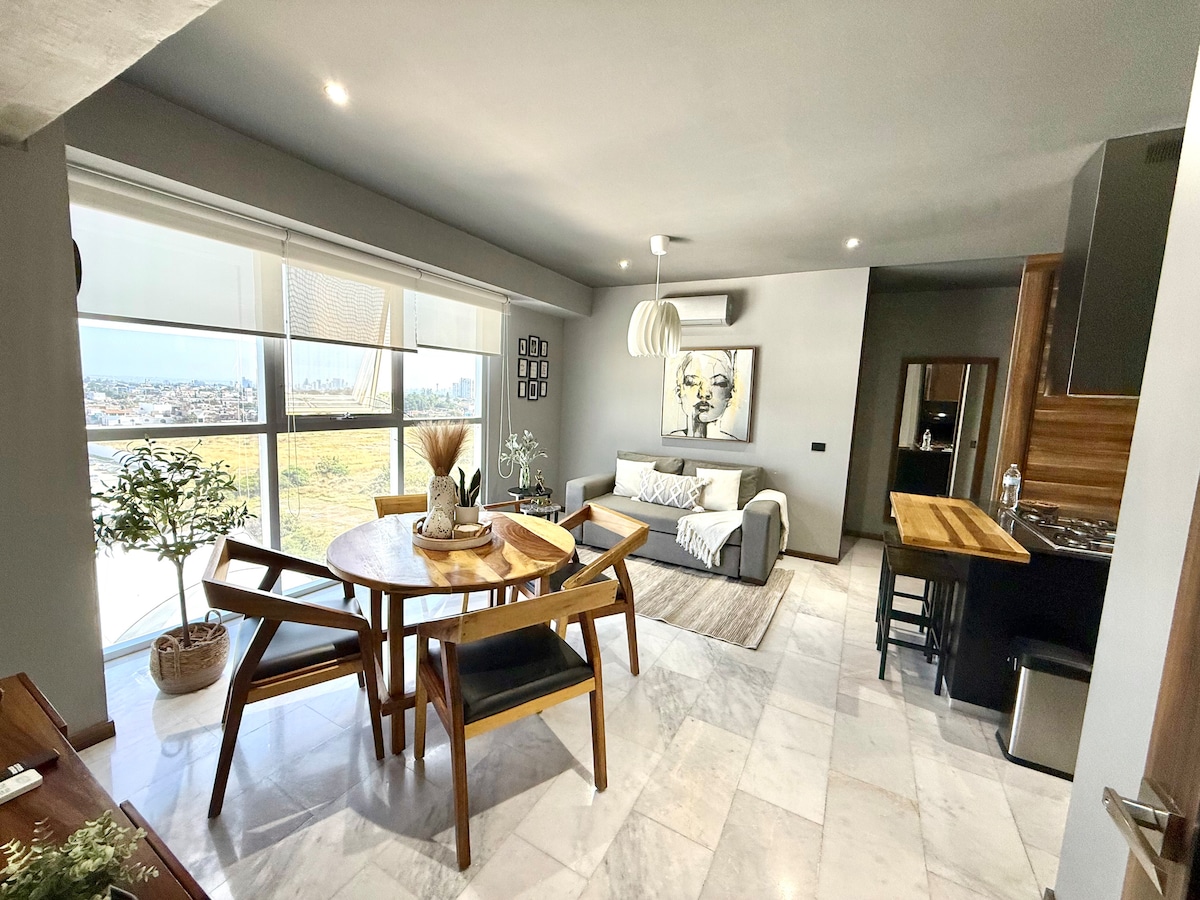 Departamento nuevo, moderno y preciso, con aire acondicionado, en el 4 piso, totalmente amueblado. Para viajes de negocios, con pareja o familia. Todas las comodidades que incluyen: elevador, alberca semi-techada única en la zona, terraza, asador, mesas, sillas y camastros, seguridad privada 24/7, estacionamiento con 2 cajones dentro del desarrollo. Parque con pista de jogging y área de juegos infantiles.