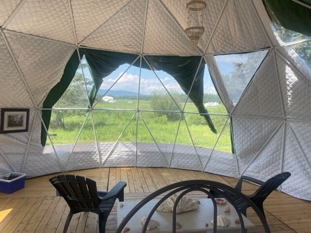 The Raven (Dome #2) ¡Disfruta de la magia de las estrellas, las auroras boreales y la naturaleza! Este alojamiento único se encuentra en nuestra granja familiar de 100 años de antigüedad. Ven a experimentar algo hermoso mientras revivimos nuestra granja familiar en un refugio especial. ¡Tenemos 3 cúpulas geodésicas listas para darte la bienvenida! ¡Tu experiencia de glamping incluye una acogedora cama tamaño queen, cúpula de cielo abierto, una estufa de leña, una gran terraza y una hamaca privada para 2 personas para disfrutar del aire libre! +más ¡Ahora contamos con sauna, fogata, baño y un refugio con parrilla!