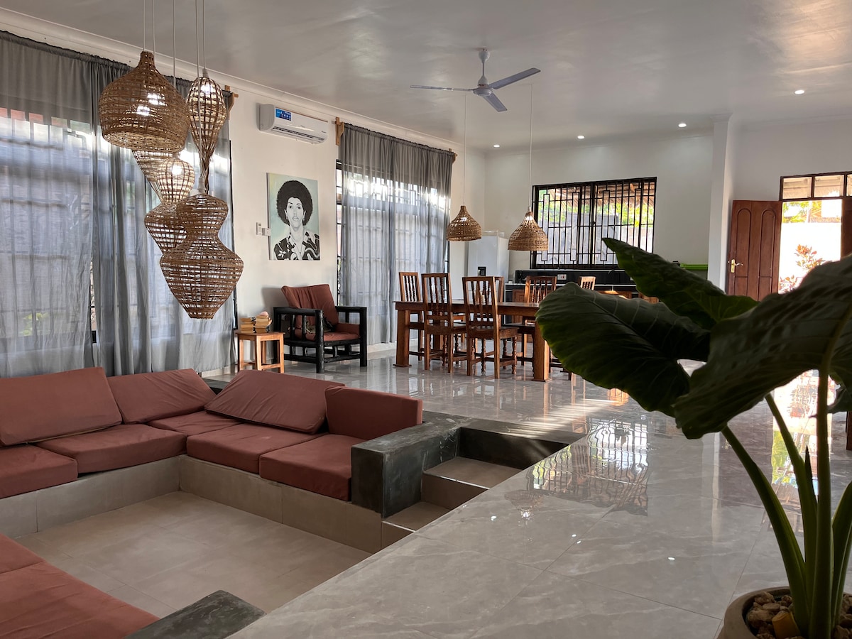 Esta maravillosa casa tiene 3 dormitorios, 2 baños, una gran cocina con una sala de estar y comedor abiertos y un maravilloso lugar para sentarse afuera y disfrutar del jardín y la puesta de sol. Nyumbani, se traduce en «sentirse como en casa», con muebles artesanales locales y una verdadera puerta zanzbariana, ¡la villa te invita a tu casa en Zanzíbar! Las playas más hermosas están a poca distancia a pie (10-15 minutos). Es una zona muy segura con vecinos internacionales. Todas las habitaciones tienen aire acondicionado.