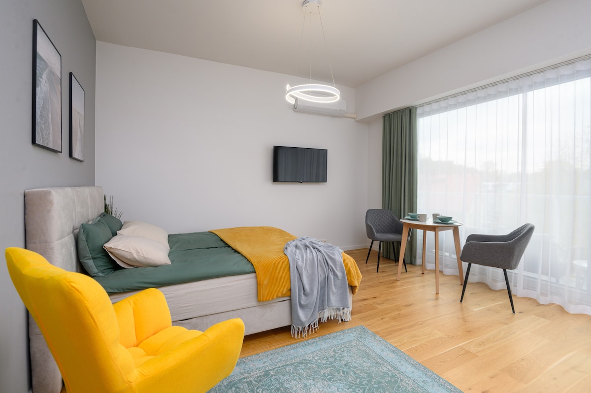 A cozy and bright 45 m² studio in the heart of Pärnu with a view of the Town Hall. Perfect for an winter getaway. Everything is nearby: cafes, shops, and the theater. The apartment features a comfortable bed, a fully equipped kitchen, spacious bathroom, lounge area with a large TV, and excellent Wi-Fi. Free courtyard parking (subject to availability). Ideal for couples and business trips. No parties. Easy self check-in, responsive host