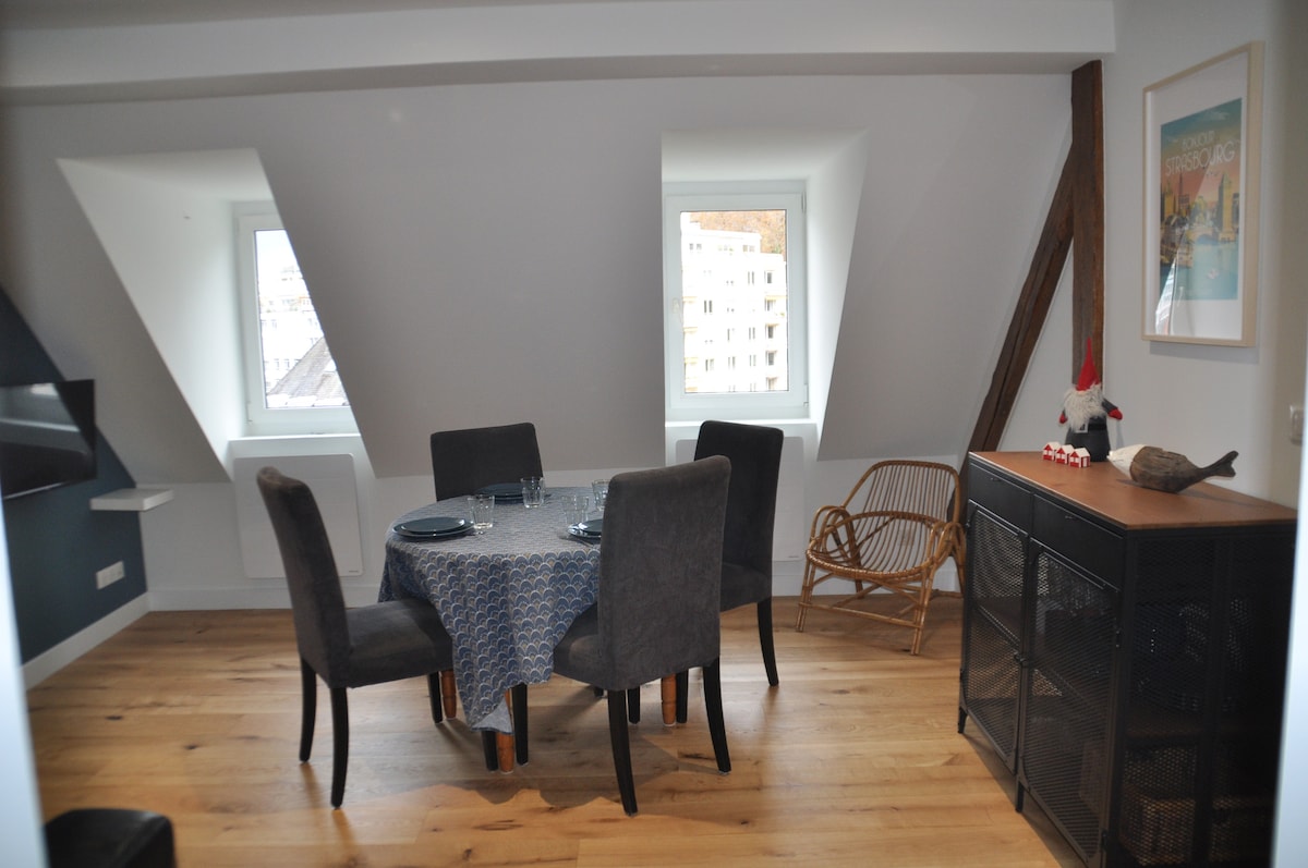 Bienvenue au « Ehrmann », cet élégant appartement central de 60m² avec Sauna, entièrement rénové avec style, offrant tout le confort et les équipements nécessaires pour un séjour inoubliable ! A proximité du parc du Contades, à deux pas du centre historique de Strasbourg et proche des institutions européennes Profitez d'un moment de détente dans le sauna privatif attenant à votre logement avant de planifier votre journée du lendemain !