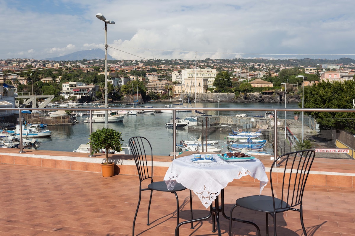 ¡La terraza en Port Ulysses representa el lujo de la simplicidad y unas vacaciones en las que tendrás todas las comodidades que deseas tener en casa! Tan pronto como entres, te cautivarás por el mar, sus impresionantes vistas del puerto deportivo y de su terraza que te ofrecerá mágicas puestas de sol. Y luego, gira un poco la mirada y nuestro Etna aparecerá como en una postal. Un alojamiento al que no puedes volver después de un día agotador y que permanecerá en tu corazón como un pedazo de nuestra hermosa ciudad.