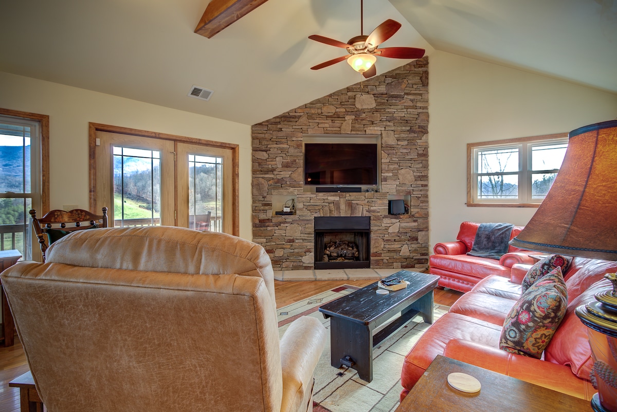 Moderna cabaña alpina junto a Blue Ridge Parkway con chimenea exterior